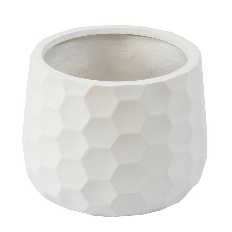 This planter pot features a durable design and a textured look, making it suitable for year-round outdoor use. It's crafted from a magnesium oxide composite, and it comes in a matte white hue for an inviting vibe. A rounded silhouette is accented with hexagons across the surface for a boldly dimensional look. This planter has a drainage hole to keep your plants or flowers healthy and hydrated. And since it's designed to resist rust and weather, you can leave it on your patio or porch without worry.