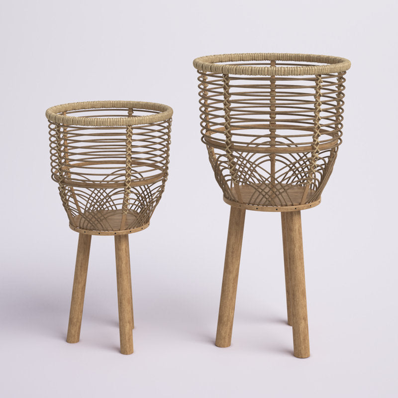 Enhance any indoor or outdoor space with this stylish set of two elevated planters, designed to bring a modern yet rustic charm to your home or garden. Crafted from a durable blend of wood, metal, and woven bamboo, these plant stands feature a beautiful natural brown finish that complements any decor. The breathable open-weave design promotes air circulation, keeping your plants healthy, while sturdy wooden legs ensure stability and durability. With ample space and convenient dimensions of 10x10x18 inches and 12x12x22 inches, these planters are perfect for showcasing your favorite greenery, from small succulents to lush ferns. Their lightweight construction makes them easy to move and arrange, allowing you to create a stylish focal point in your living room, patio, or entryway. Whether used as a decorative accent or functional planter, this set offers an elegant way to elevate your decor. Transform your space with a touch of natural beauty and order yours today.